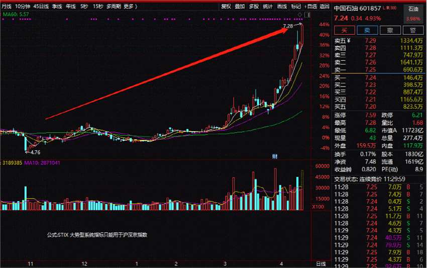 今天上午石油股表現(xiàn)強(qiáng)勁,股價(jià)大漲4.93%。