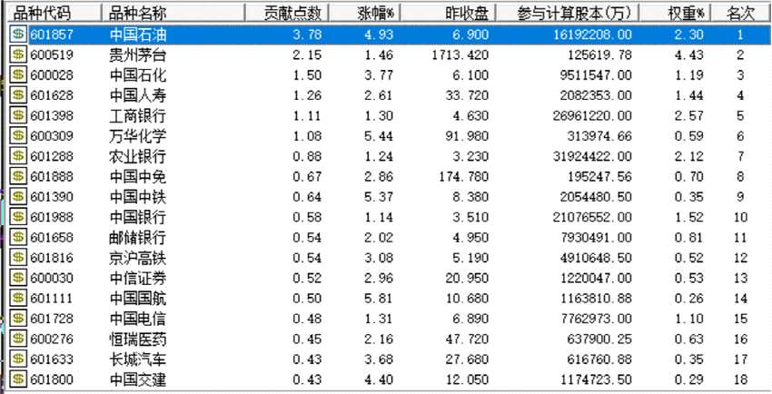 從指數(shù)貢獻(xiàn)度來看,上證指數(shù)的成份股當(dāng)中,中國(guó)石油、貴州茅臺(tái)(600519)、中國(guó)石化、中國(guó)人壽(601628)、工商銀行、萬華化學(xué)(600309)等貢獻(xiàn)較大。