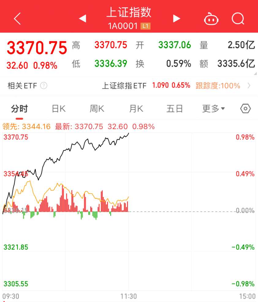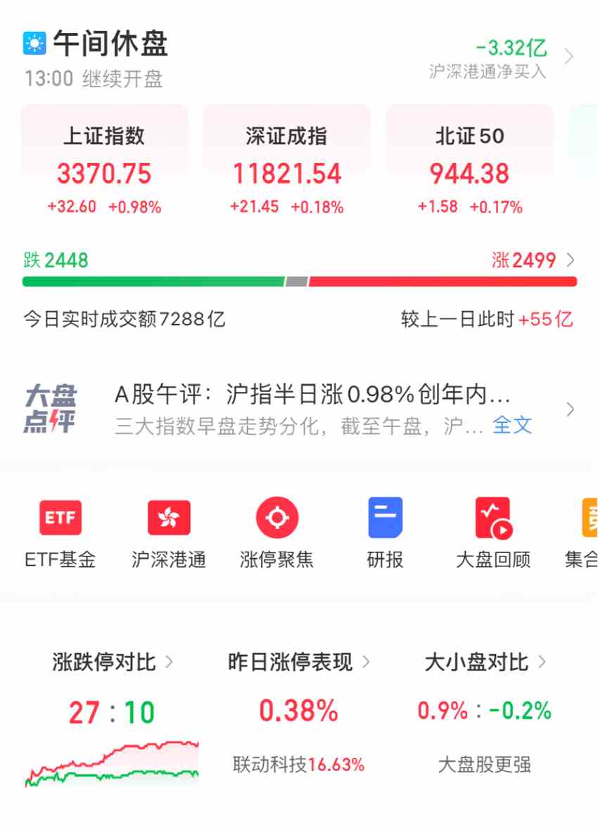 上午收盤,上證指數(shù)收漲0.98%,報(bào)3370點(diǎn);主要受益于石油石化、保險(xiǎn)、銀行等中字頭股票表現(xiàn),深證成指、創(chuàng)業(yè)板和科創(chuàng)板表現(xiàn)稍遜,深證成指漲0.18%,創(chuàng)業(yè)板指數(shù)受傳媒、醫(yī)療等拖累反而微跌0.05%,科創(chuàng)50指數(shù)漲0.22%,個(gè)股2499只上漲,2448只下跌,成交額7288億元,較上個(gè)交易日有所放大。