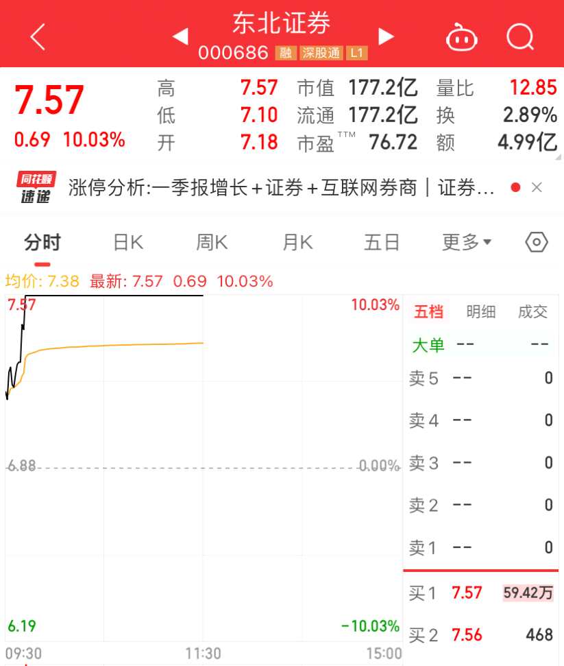 近期多家券商發(fā)布一季度業(yè)績(jī)預(yù)告和業(yè)績(jī)快報(bào),業(yè)績(jī)表現(xiàn)亮眼。周末東北證券又發(fā)布喜人的業(yè)績(jī)快報(bào),今天開盤后東北證券快速?zèng)_漲停。