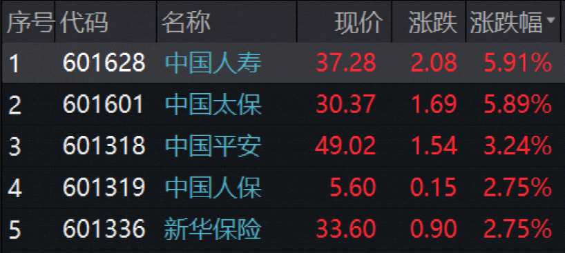 A股5家上市險(xiǎn)企上午全線走紅,中國(guó)人壽(601628)、中國(guó)太保(601601)漲近6%。