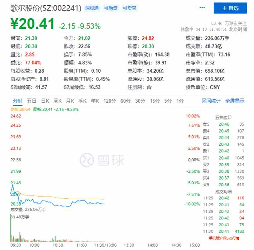 4月18日上午,歌爾股份(002241)低開6.83%,盤中持續(xù)走弱,上午約10:30觸及跌停板。截至上午收盤,歌爾股份股價(jià)來(lái)到20.41元/股,跌幅9.53%,市值跌至698億。