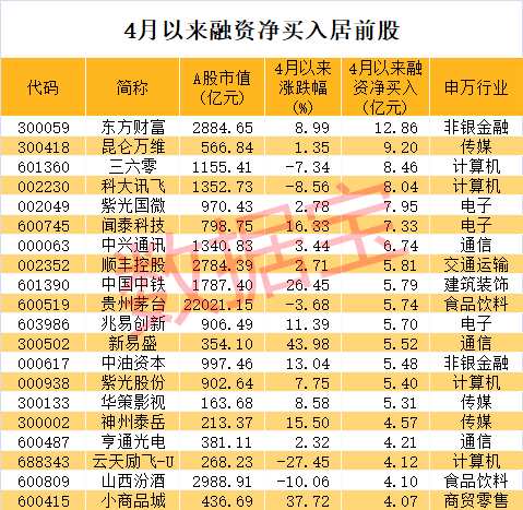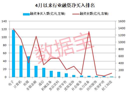 分行業(yè)看,TMT(包括計算機、傳媒、通信、電子)板塊成為融資資金的新寵。4月以來,TMT板塊合計獲得融資凈買入271.59億元,占A股融資凈買入總額的九成以上。
