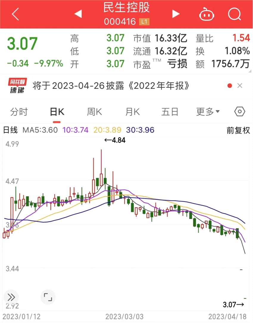 4月18日早盤,民生控股(000416)再次跌停,封單超過35萬手。截至午間收盤,該股報價3.07元/股,創(chuàng)四年來新低。