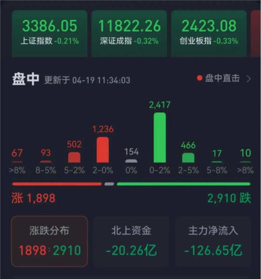 周三(4月19日),三大股指繼續(xù)震蕩整理,略有回落。截至上午收盤,上證指數(shù)跌幅達(dá)0.21%,報(bào)3386.05點(diǎn);深證成指和創(chuàng)業(yè)板指跌幅分別為0.32%和0.33%;滬深兩市合計(jì)成交額6408.4億元,總體來看,兩市個(gè)股跌多漲少。