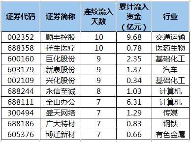摘要: 數(shù)據(jù)寶統(tǒng)計,截至4月19日收盤,滬深兩市共有56只個股連續(xù)5日或5日以上主力資金凈流入。連續(xù)流入天數(shù)最多的是順豐控股(002352)、祥生醫(yī)療,均已連續(xù)10個交易日凈流入。