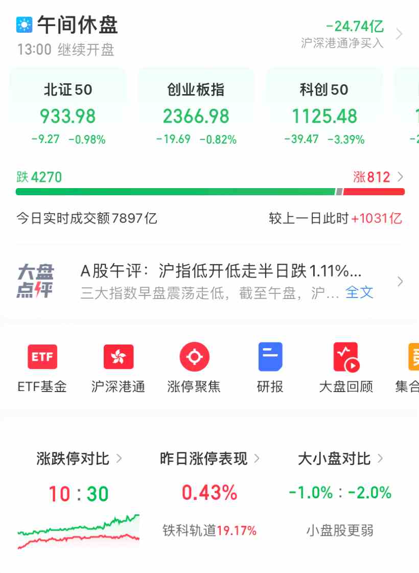 連續(xù)三天每天超3000只個(gè)股下跌之后,今天上午更是超4000只個(gè)股下跌,一些績(jī)差股票表現(xiàn)慘烈,上午有10股股價(jià)處于1元以下,瀕臨觸發(fā)跌破1元面值退市。上午收盤,主要指數(shù)普遍下跌,上證指數(shù)跌超1%,跌1.11%,深證成指跌1.48%,創(chuàng)業(yè)板指數(shù)跌0.82%,科創(chuàng)50指數(shù)受累半導(dǎo)體及元件概念,大跌3.39%,個(gè)股4270只下跌,僅812只上漲,成交額7897億元,較昨日上午放大1031億元。港股也出現(xiàn)明顯下跌。