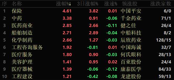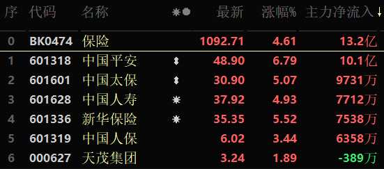 從早盤表現(xiàn)強(qiáng)勢的保險(xiǎn)行業(yè)看,交易中的6只成份股全線上漲,其中,有3只個(gè)股漲幅超5%。資金方面,有13.2億元大單資金凈流入該行業(yè),居各行業(yè)第1位。