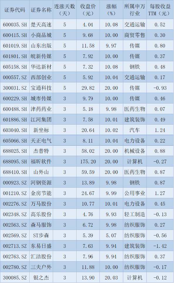 連續(xù)上漲3日且今日收盤漲停股一覽