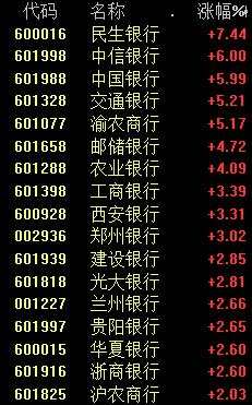 今天上午,銀行板塊延續(xù)反彈態(tài)勢,民生銀行上漲7.44%,中信銀行上漲6%,中國銀行上漲5.99%。