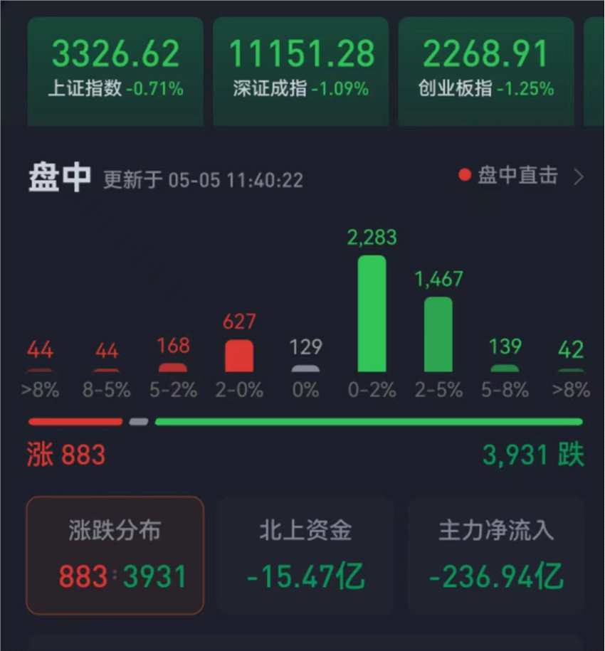 周五(5月5日),三大股指震蕩回落。截至上午收盤,上證指數(shù)跌幅達(dá)0.71%,報3326.62點;深證成指和創(chuàng)業(yè)板指跌幅分別為1.09%和1.25%;滬深兩市合計成交額7222.9億元,總體來看,兩市個股跌多漲少。