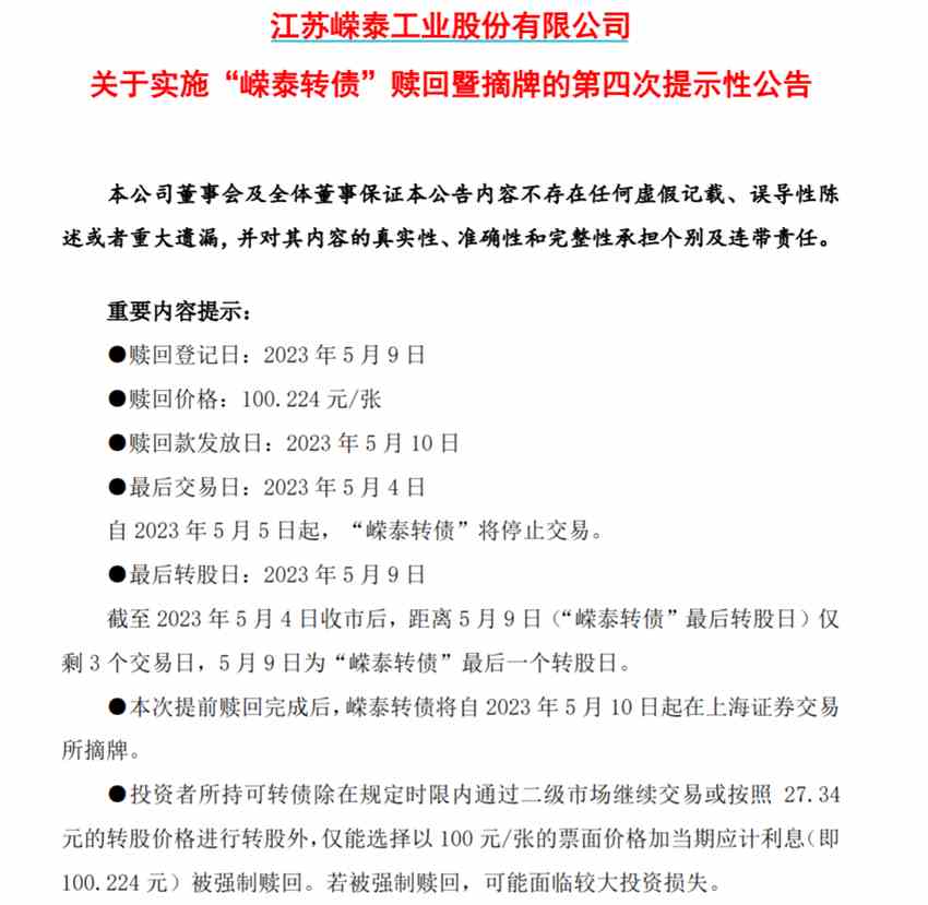 4月26日,江蘇嶸泰工業(yè)股份有限公司在上交所網(wǎng)站發(fā)布關(guān)于實(shí)施“嶸泰轉(zhuǎn)債”贖回暨摘牌的公告稱,嶸泰轉(zhuǎn)債最后一個(gè)交易日為2023年5月4日,自2023年5月5日起將停止交易。公司后續(xù)分別于4月27日、4月28日、4月29日、5月5日發(fā)布4次提示性公告。