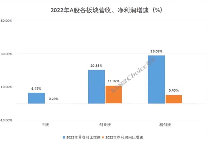 分板塊看,主板、創(chuàng)業(yè)板、科創(chuàng)板2022年分別實(shí)現(xiàn)營(yíng)業(yè)收入66.66萬億元、3.51萬億元、1.21萬億元,較2021年增長(zhǎng)6.47%、20.35%、29.08%;