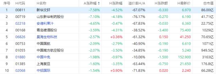 截至A股收盤,AH股跌幅前10如下: