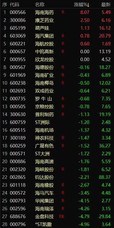 海南板塊方面,今日僅5只個(gè)股上漲,海南海藥大幅收漲8.07%,報(bào)5.49元/股。