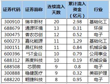 主力資金連續(xù)5日以上凈流入瑞豐新材等70股
