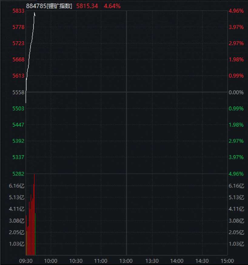 受現(xiàn)貨市場超預(yù)期反彈影響,5月15日上午鋰礦板塊大幅攀升,鋰礦指數(shù)一度漲近5%,總市值逼近7600億元。