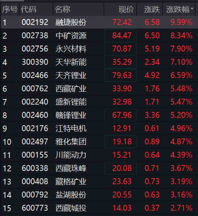個(gè)股方面,融捷股份(002192)輕松站上漲停板,中礦資源(002738)、天齊鋰業(yè)(002466)、盛新鋰能(002240)、贛鋒鋰業(yè)(002460)等權(quán)重股高開高走。
