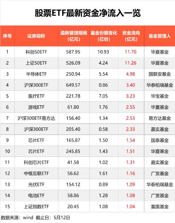 從資金凈買入排行看,截至上周五,科創(chuàng)50ETF、上證50ETF凈流入資金居前,都超過11億元。寬基指數(shù)中,華泰柏瑞、易方達(dá)和嘉實基金旗下滬深300ETF,富國上證指數(shù)ETF等產(chǎn)品,凈流入資金也位居前列。