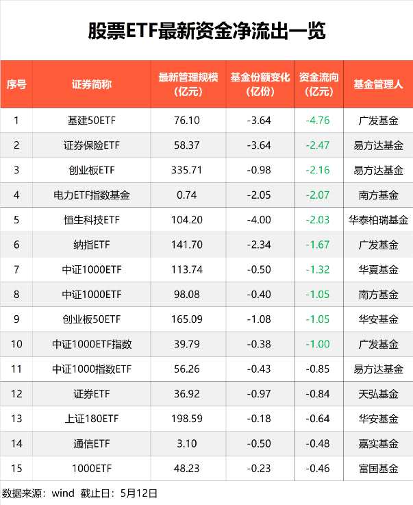 從資金凈流出榜單看,今年漲幅超20%的基建50ETF單日凈流出4.76億元,為單日之最。另外,證券保險ETF、電力ETF指數(shù)基金、恒生科技ETF等多只產(chǎn)品,單日凈流出資金也超過2個億。