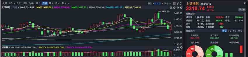 然而,下午開(kāi)盤(pán)之后,大盤(pán)上演絕地反擊好戲,滬指從下跌30多點(diǎn),到收盤(pán)上漲38.38點(diǎn),日內(nèi)拉升超70點(diǎn)。最終,滬指以3310.74點(diǎn)報(bào)收,收出帶長(zhǎng)下影線的中陽(yáng)線。