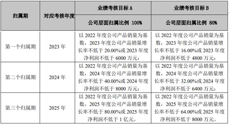 業(yè)績(jī)考核目標(biāo)B為:2023年-2025年產(chǎn)品銷量增長(zhǎng)率分別不低于16%、32%、64%或凈利潤(rùn)分別不低于4800萬元、6400萬元、8000萬元,公司層面對(duì)應(yīng)歸屬比例為80%。