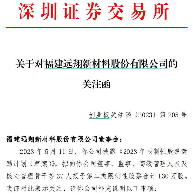 5月15日,深交所向遠(yuǎn)翔新材下發(fā)關(guān)注函,就股票激勵(lì)計(jì)劃要求公司說明凈利潤(rùn)考核指標(biāo)的合理性,以及激勵(lì)對(duì)象包括實(shí)控人王承輝、王承輝之子王芳可,是否涉嫌利益輸送及損害中小股東利益。