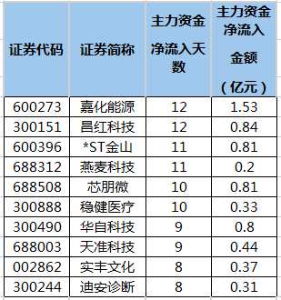 數(shù)據(jù)寶統(tǒng)計,截至5月15日收盤,滬深兩市共有71只個股連續(xù)5日或5日以上主力資金凈流入。連續(xù)流入天數(shù)最多的是嘉化能源(600273)、昌紅科技(300151),均已連續(xù)12個交易日凈流入。連續(xù)凈流入天數(shù)較多的還有*ST金山(600396)、燕麥科技、芯朋微、穩(wěn)健醫(yī)療(300888)、華自科技(300490),分別獲11個、11個、10個、10個、9個交易日凈流入。