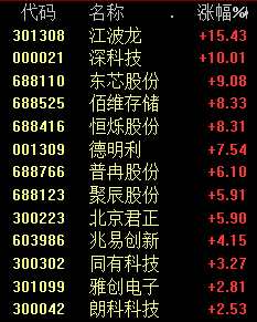 今天上午,芯片概念盤中拉升,其中存儲芯片概念漲幅居前,江波龍(301308)漲超15%,深科技(000021)漲停。