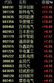 風電概念也爆發(fā),智洋創(chuàng)新漲超13%、新特電氣(301120)漲超11%。