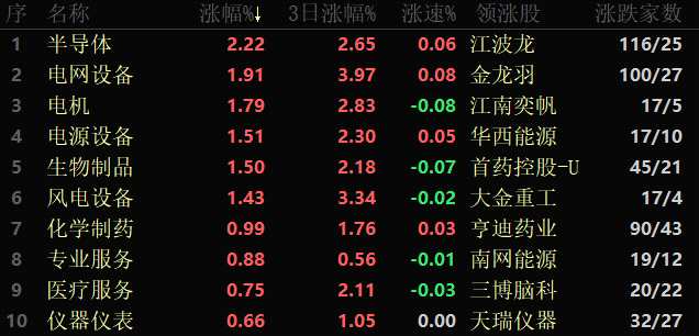 東方財富(300059)行業(yè)方面,截至5月16日11:30,86個行業(yè)板塊中25個上漲,占比29.07%,其中,半導體行業(yè)漲幅居前,達2.22%,此外,電網(wǎng)設備、電機、電源設備、生物制品和風電設備等五行業(yè)漲幅均超1%。下跌方面,教育行業(yè)居首,跌幅達5.08%,此外,文化傳媒、互聯(lián)網(wǎng)服務和游戲行業(yè)跌幅均超2%。