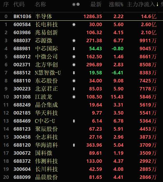 從早盤表現(xiàn)強勢的半導體行業(yè)看,交易中的141只成份股有116只上漲,其中,有22只個股漲幅超5%。資金方面,有14.6億元大單資金凈流入該行業(yè),居各行業(yè)第1位。