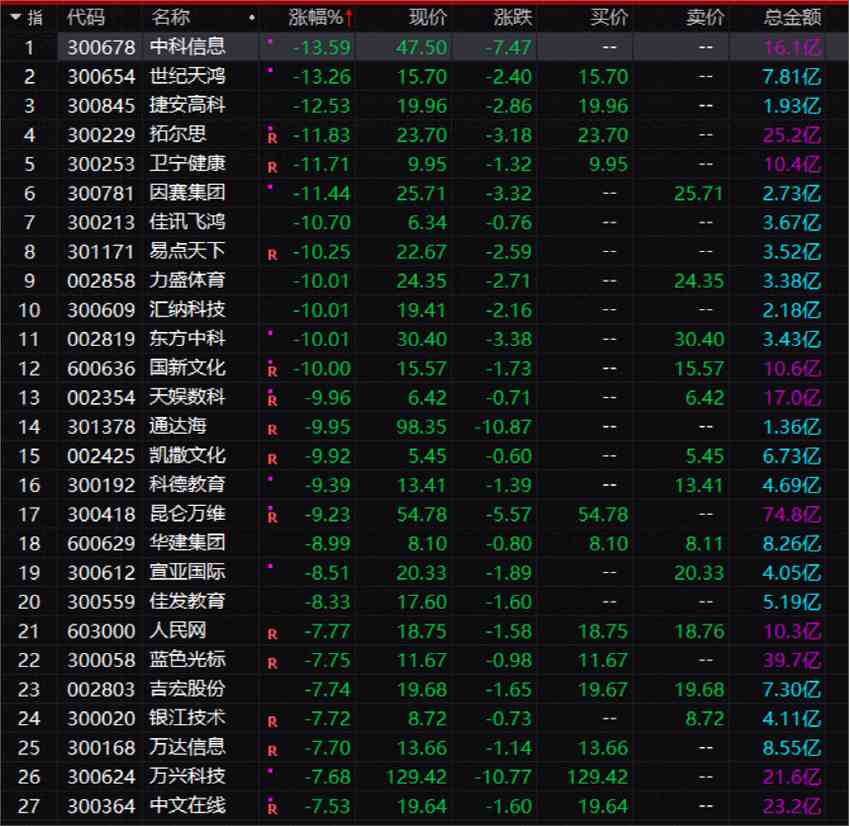 總市值5.7萬億的人工智能大賽道,今年來最火爆的板塊,再度上演大跳水。多只個股跌?;虻?0%。中科信息(300678)、世紀天鴻(300654)、拓爾思(300229)等跌超10%,力盛體育(002858)、東方中科(002819)等紛紛10%跌停。