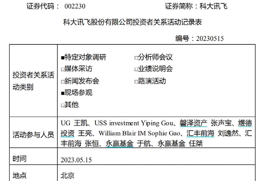 科大訊飛信息顯示,昨日多家公募私募以及外資機構前往參觀調(diào)研,就星火大模型、訊飛星火如何基于AI開放平臺構建商業(yè)生態(tài)等進行交流。