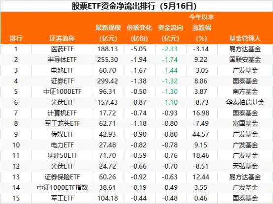 從資金凈流出情況看,5月16日當天,多只行業(yè)主題ETF資金凈流出霸榜,集中在醫(yī)藥、電池、證券等板塊。