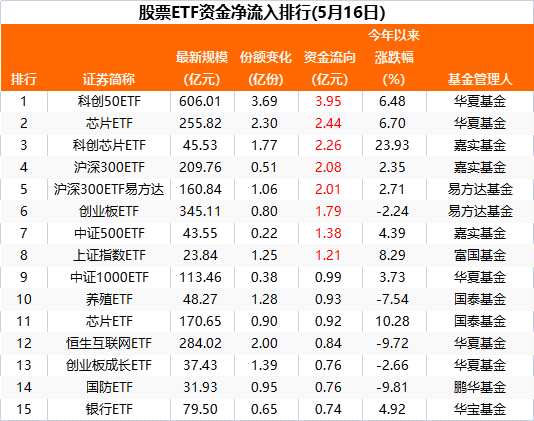 從資金凈流入排行看,5月16日當天收盤,科創(chuàng)50ETF、滬深300ETF、創(chuàng)業(yè)板ETF等寬基指數(shù),以及芯片ETF等行業(yè)指數(shù)產(chǎn)品受到資金青睞,資金凈流入排行居前。