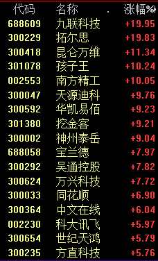 游戲、傳媒、ChatGPT 等板塊強(qiáng)勢修復(fù),ChatGPT板塊中,拓爾思(300229)漲超19%,昆侖萬維(300418)、孩子王(301078)等個股漲幅居前。