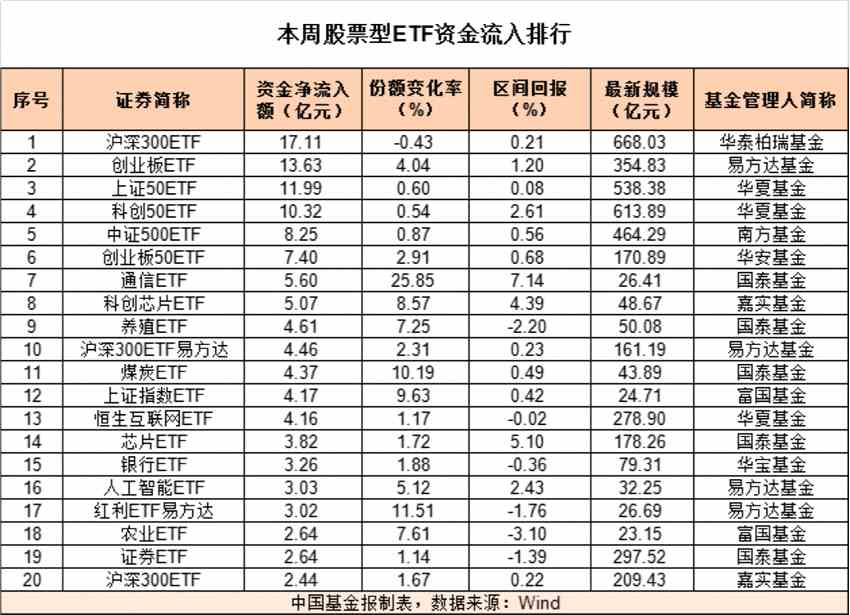 資金凈流入額前十榜單中,還有3只主題指數(shù)產品。其中,本周收益漲幅居前的國泰通信ETF,以5.6億元的周資金凈流入額排在第七位。嘉實科創(chuàng)芯片ETF、國泰養(yǎng)殖ETF則分別為5.07億元、4.61億元,排在第8、9位。