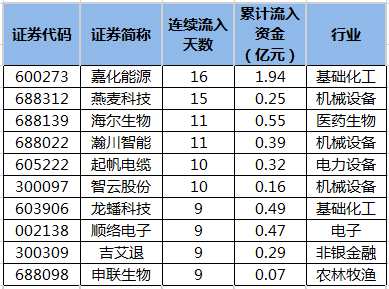 截至5月19日收盤,滬深兩市共有70只個股連續(xù)5日或5日以上主力資金凈流入。連續(xù)流入天數(shù)最多的是嘉化能源(600273),已連續(xù)16個交易日凈流入。連續(xù)凈流入天數(shù)較多的還有燕麥科技、海爾生物、瀚川智能、起帆電纜(605222)、智云股份(300097),分別獲15個、11個、11個、10個、10個交易日凈流入。