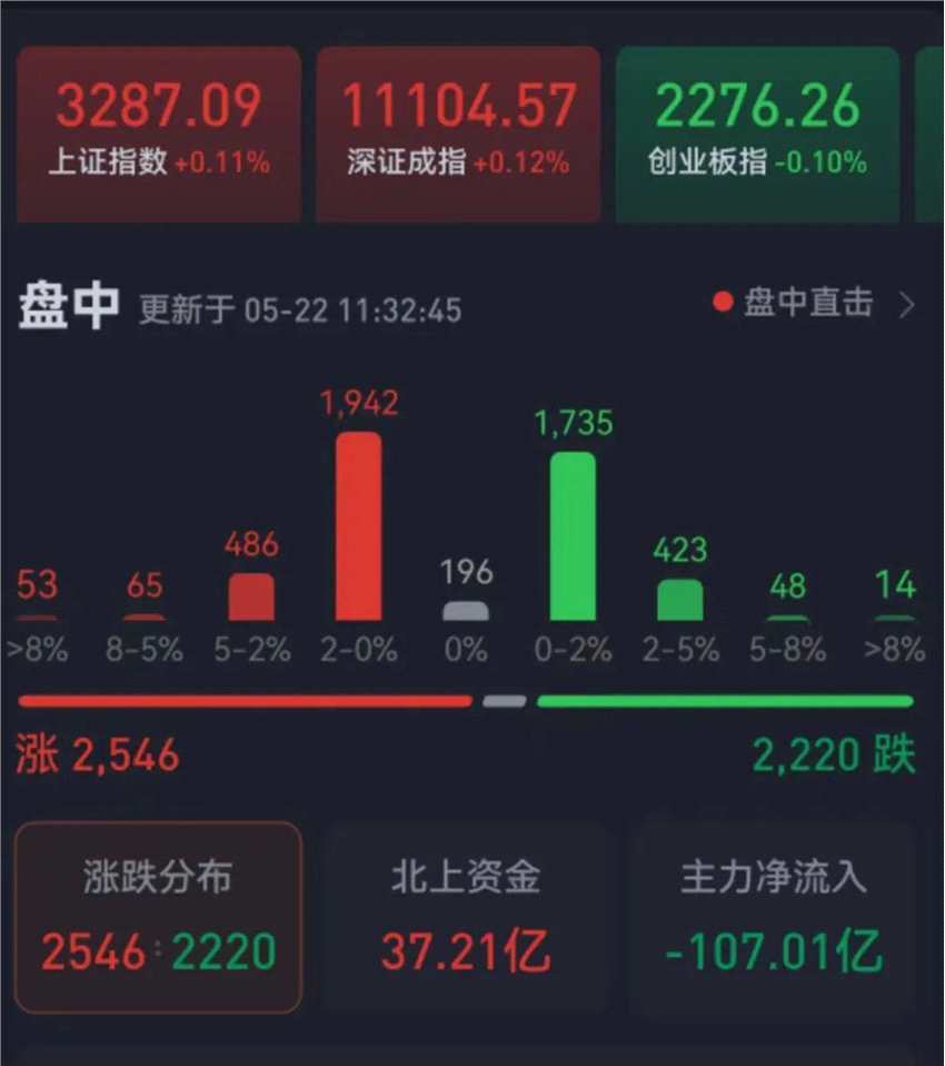 周一(5月22日),三大股指震蕩分化。截至上午收盤,上證指數(shù)上漲0.11%,報3287.09點;深證成指上漲0.12%,創(chuàng)業(yè)板指跌幅為0.10%;滬深兩市合計成交額5193.3億元,總體來看,兩市個股漲多跌少。