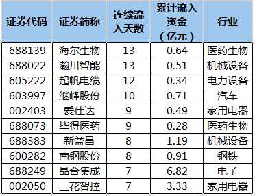 數(shù)據(jù)寶統(tǒng)計(jì),截至5月23日收盤,滬深兩市共有53只個(gè)股連續(xù)5日或5日以上主力資金凈流入。連續(xù)流入天數(shù)最多的是海爾生物、瀚川智能,均已連續(xù)13個(gè)交易日凈流入。連續(xù)凈流入天數(shù)較多的還有起帆電纜(605222)、繼峰股份(603997)、愛仕達(dá)(002403)、畢得醫(yī)藥、新益昌,分別獲12個(gè)、10個(gè)、9個(gè)、9個(gè)、8個(gè)交易日凈流入。