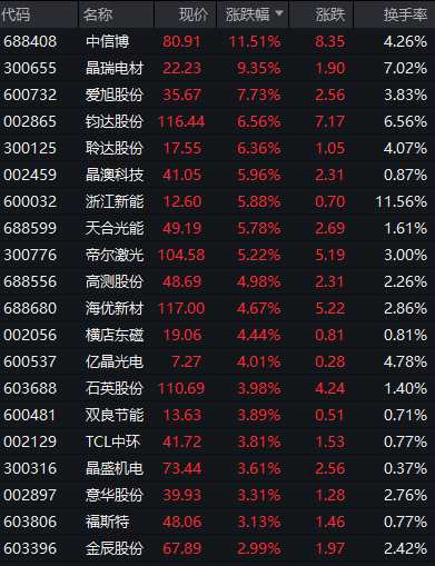 此外,光伏股盤中走強(qiáng),中信博、晶瑞電材、愛旭股份(600732)、鈞達(dá)股份(002865)等均漲超5%。