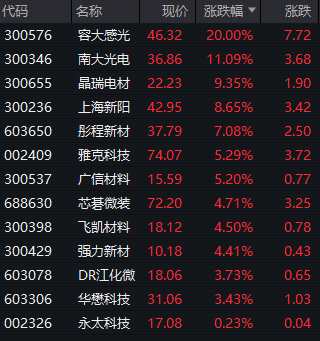 光刻膠概念股表現(xiàn)活躍,容大感光(300576)20CM漲停,南大光電(300346)、晶瑞電材(300655)、上海新陽(300236)等漲超8%。