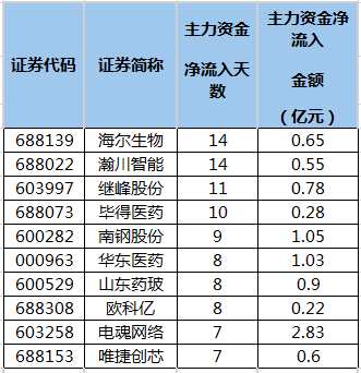 數(shù)據(jù)寶統(tǒng)計,截至5月24日收盤,滬深兩市共有46只個股連續(xù)5日或5日以上主力資金凈流入。連續(xù)流入天數(shù)最多的是海爾生物、瀚川智能,均已連續(xù)14個交易日凈流入。連續(xù)凈流入天數(shù)較多的還有繼峰股份(603997)、畢得醫(yī)藥、南鋼股份(600282)、華東醫(yī)藥(000963)、山東藥玻(600529),分別獲11個、10個、9個、8個、8個交易日凈流入。