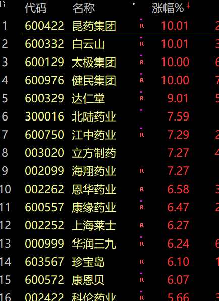 中藥板塊繼續(xù)沖高,昆藥集團(600422)、健民集團(600976)漲停,白云山、達仁堂(600329)、太極集團(600129)觸板。