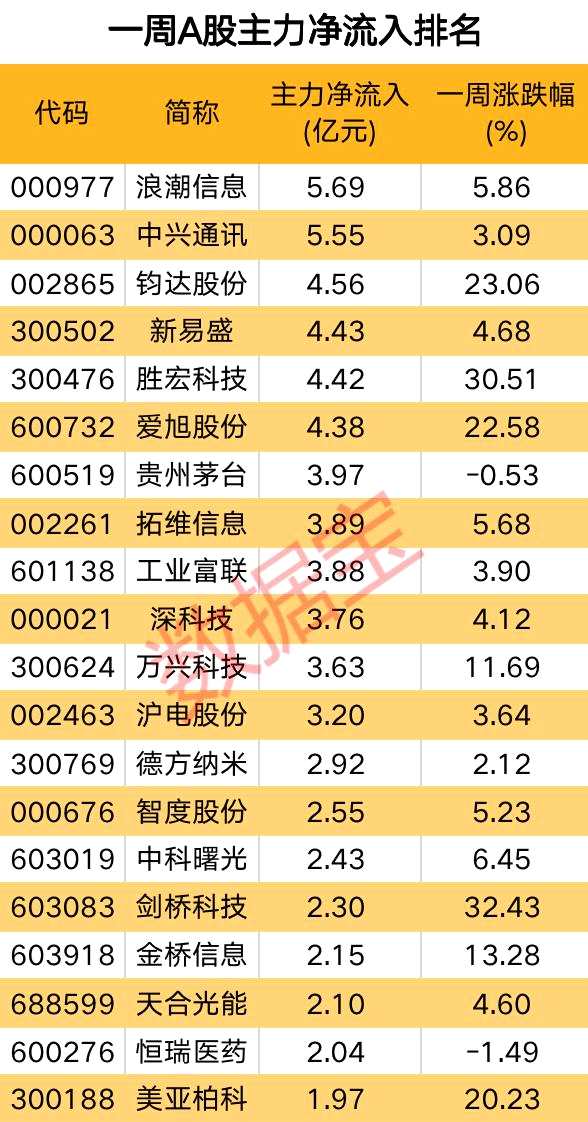 個(gè)股方面,除去近一月上市新股,浪潮信息(000977)和中興通訊主力資金凈流入居前,超過5億元。兩股均為AI概念核心標(biāo)的,受益于AI概念整體反彈,今日漲幅分別為3.66%、4.67%。此外,本周主力資金仍十分青睞TMT概念。凈流入前20的個(gè)股中,計(jì)算機(jī)板塊有6股,電子4股,通信3股,傳媒1股,合計(jì)占比達(dá)到70%。