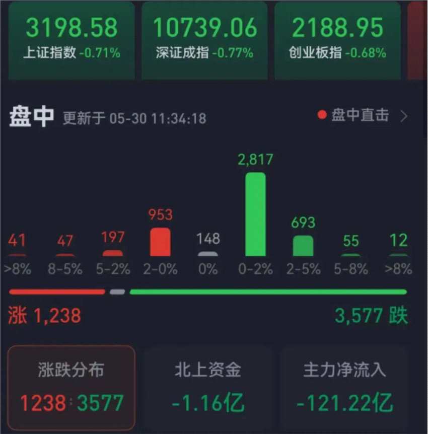 周二(5月30日),三大股指繼續(xù)震蕩整理。截至上午收盤,上證指數跌幅達0.71%,報3198.58點,失守3200點整數關口;深證成指和創(chuàng)業(yè)板指跌幅分別為0.77%和0.68%;滬深兩市合計成交額5483.8億元,總體來看,兩市個股跌多漲少,其中,漲停個股達30只,跌停個股達23只。