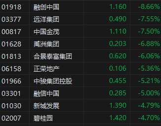 內(nèi)房股集體下跌,融創(chuàng)中國(guó)、中國(guó)金茂跌約8%,遠(yuǎn)洋集團(tuán)跌超7%,合景泰富跌6%,龍光集團(tuán)、正榮地產(chǎn)、中駿集團(tuán)跌超5%,新城發(fā)展、綠城中國(guó)、綠景中國(guó)、碧桂園、禹洲集團(tuán)、龍湖集團(tuán)等跌超4%。消息面上,國(guó)家統(tǒng)計(jì)局今早公布5月中國(guó)官方制造業(yè)及非制造業(yè)PMI均低于預(yù)期,離岸人民幣兌美元應(yīng)聲下挫,跌破7.11,再創(chuàng)半年低位。港股市場(chǎng)對(duì)人民幣敏感的內(nèi)房股全線下跌。