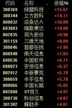 數(shù)據(jù)安全板塊也大漲,綠盟科技(300369)漲超15%,立方數(shù)科(300344)漲超14%。