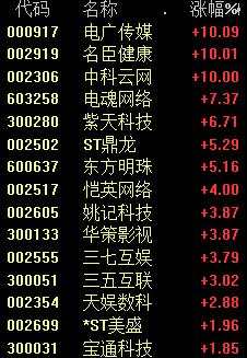 網(wǎng)絡(luò)游戲概念中,電廣傳媒(000917)、名臣健康(002919)、中科云網(wǎng)(002306)等個(gè)股漲停。